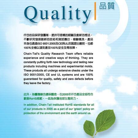 此外,為響應(yīng)綠色環(huán)保觀念,在2005年仟岱產(chǎn)品全部符合歐盟ROHS規(guī)范,一起為保護地球生態(tài)努力。